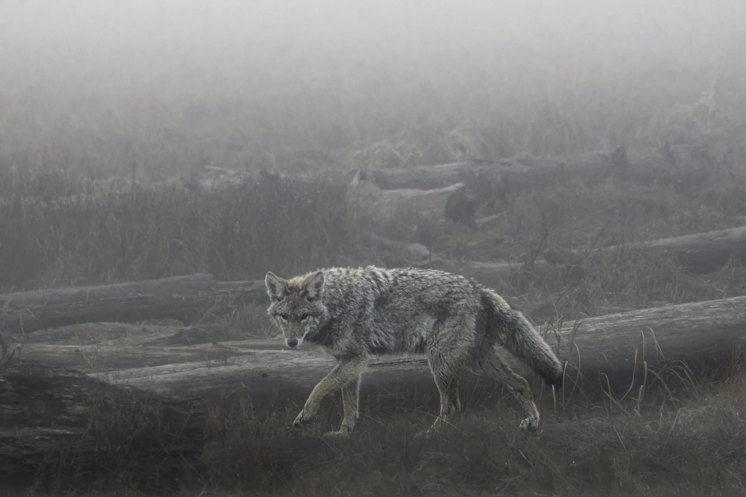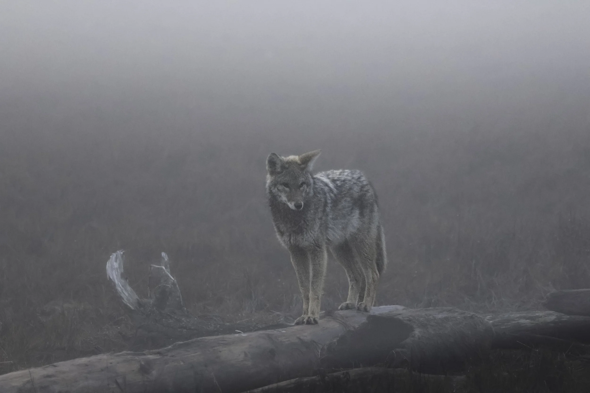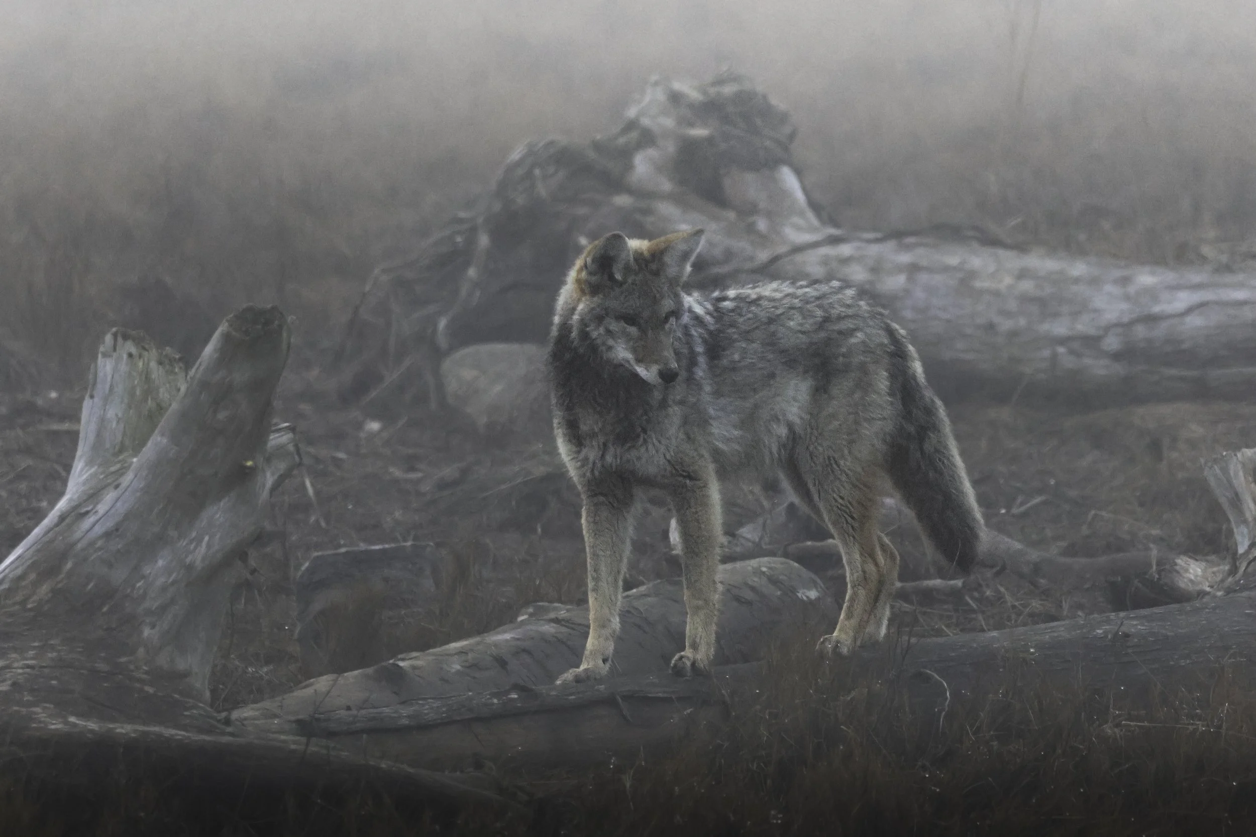 We went out to the dyke today to walk Ms Moo, and we caught a glimpse of a coyote in the fog. I gave her the camera, and she snapped away (in auto mode with the 100-400mm as I didn't think we would need that much reach given how thick the fog was). I regret she did not shoot in RAW, as these JPEGs cannot be de-noised that easily.